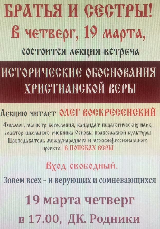Приглашаем на лекцию-встречу «Исторические обоснования христианской веры» Опубликовано 15.03.2020 germanlepekhin